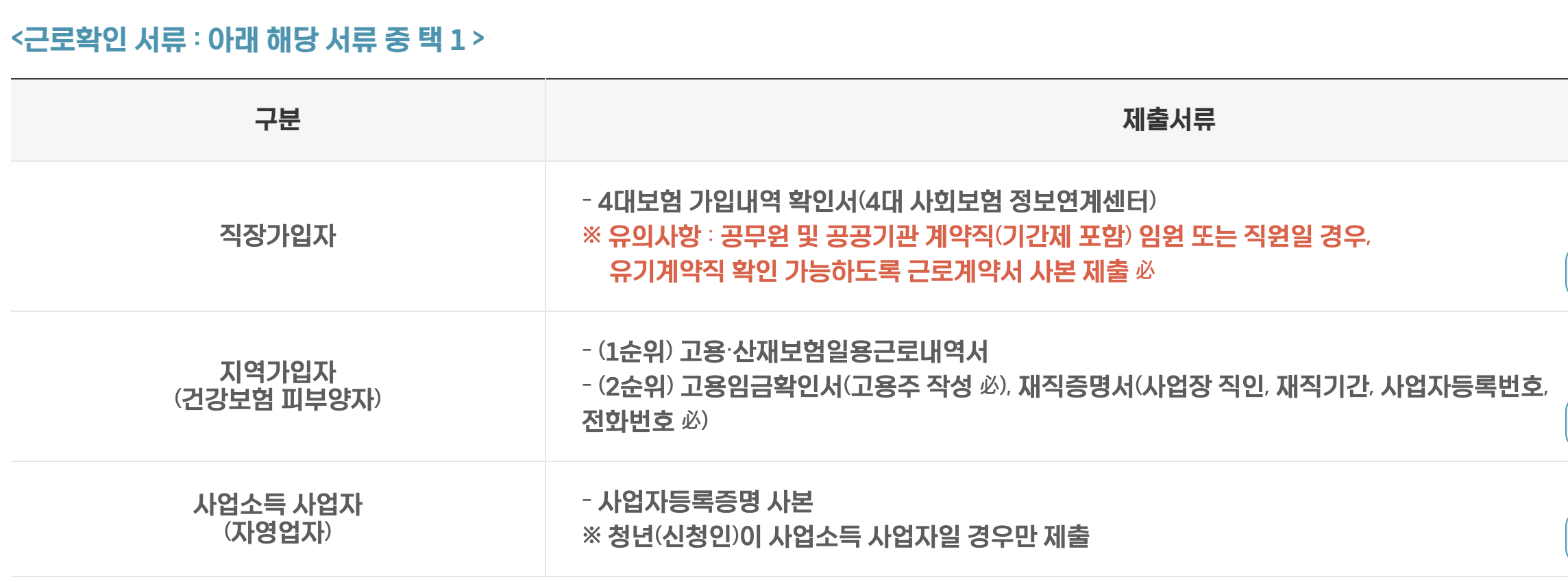 4. 근로확인 서류 : 4대보험 가입내역서, 고용임금확인서, 사업자등록증명 등 근로형태에 따라 상이