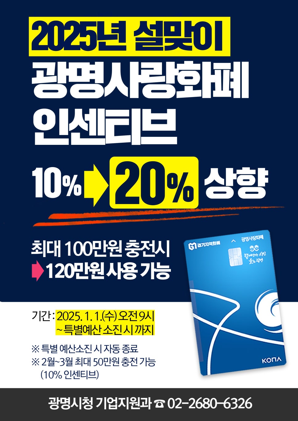 2025년 1월 한달간 광명시 지역화폐 인센티브를 20% 추가 지급합니다. 100만원 충전시 120만원 사용 가능합니다. 예산 소진시 20% w지급은 조기종료되니 서두르시기 바랍니다!