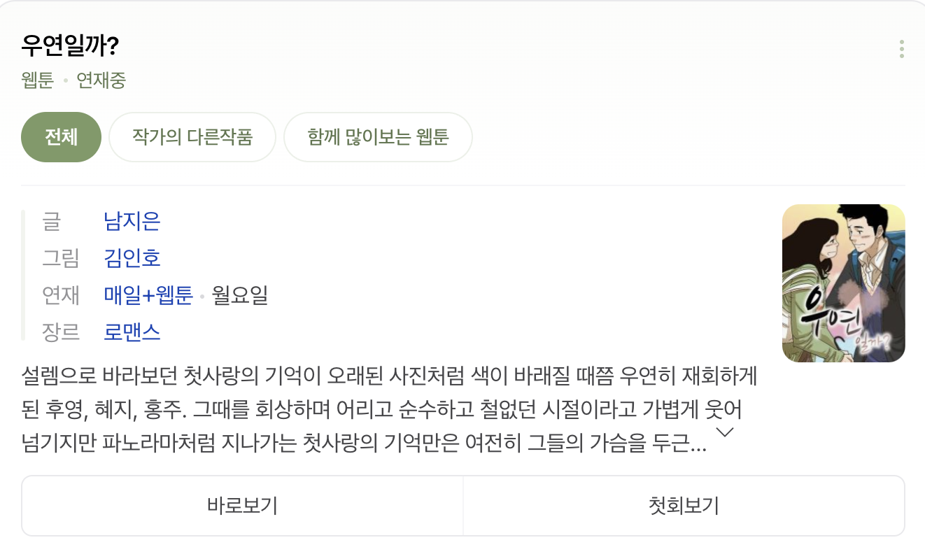 ✅ 우연일까 원작은 남지은 글, 김인호 작이며, 전체연령가로 네이버웹툰에서 현재 볼 수 있습니다.
