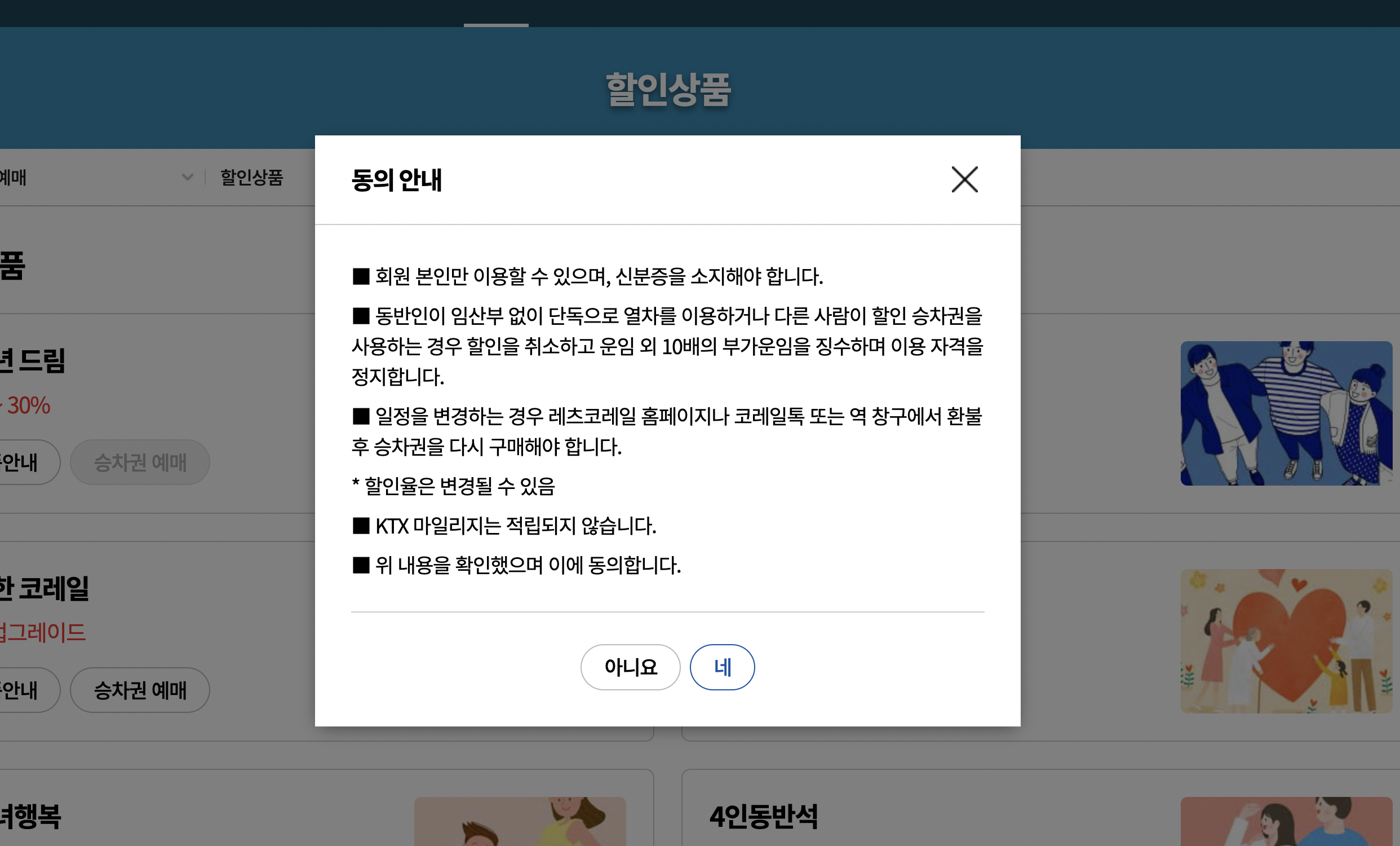 ✅ 코레일 홈페이지 → 예매 → 할인상품 → 맘편한 코레일 → 승차권 예매 선택