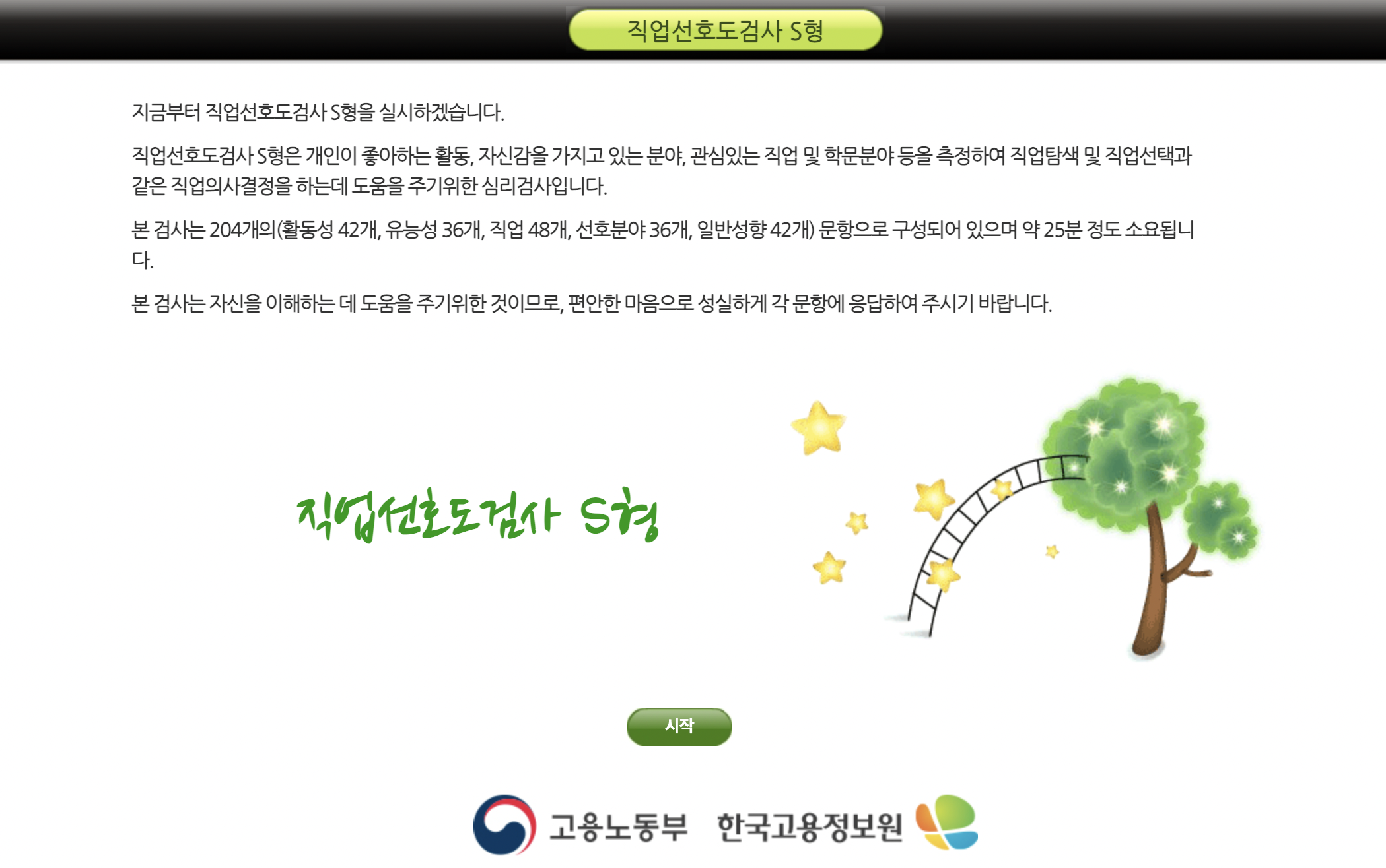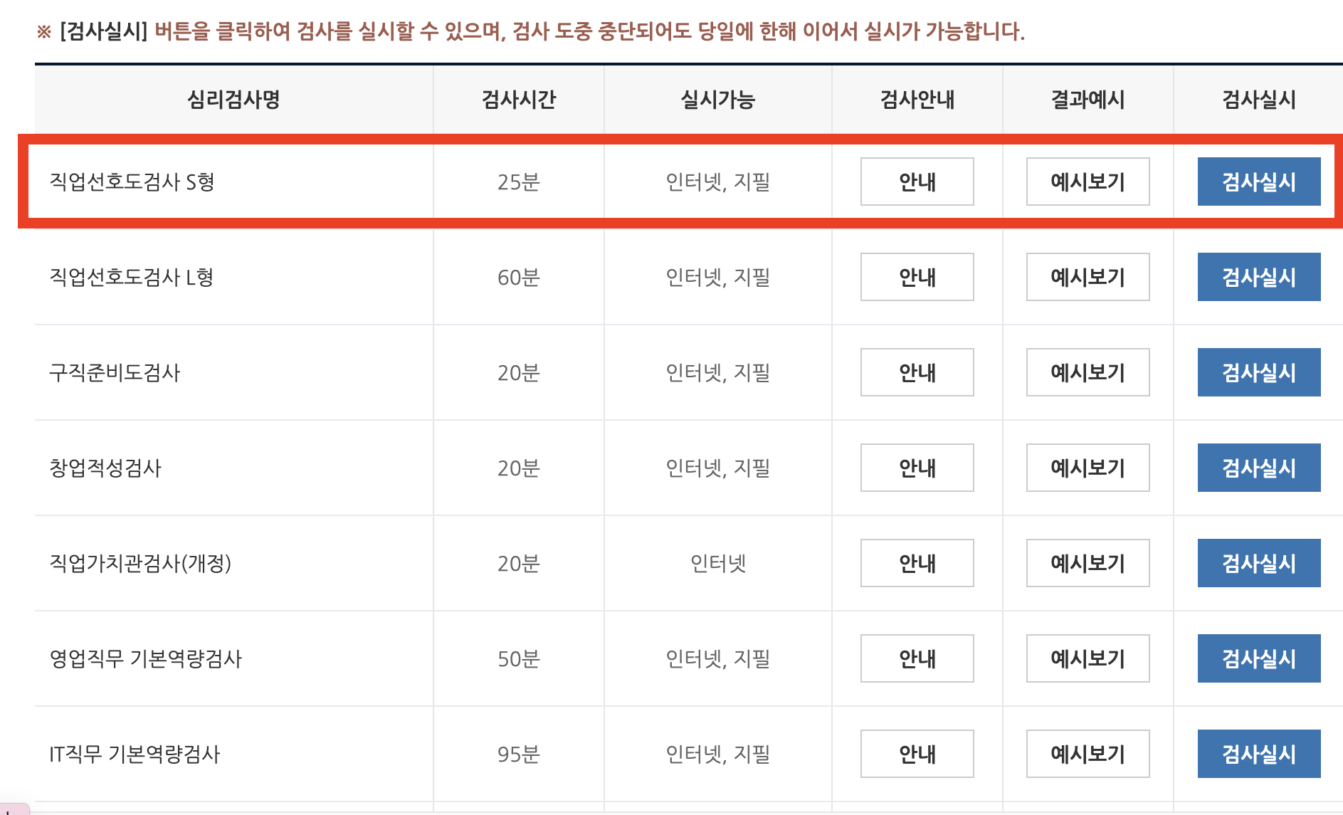 3. 아래로 스크롤을 내려 '직업선호도 검사(S형)' 실시하기를 클릭해주세요. 다른 직업심리검사를 선택하셔도 무방합니다.