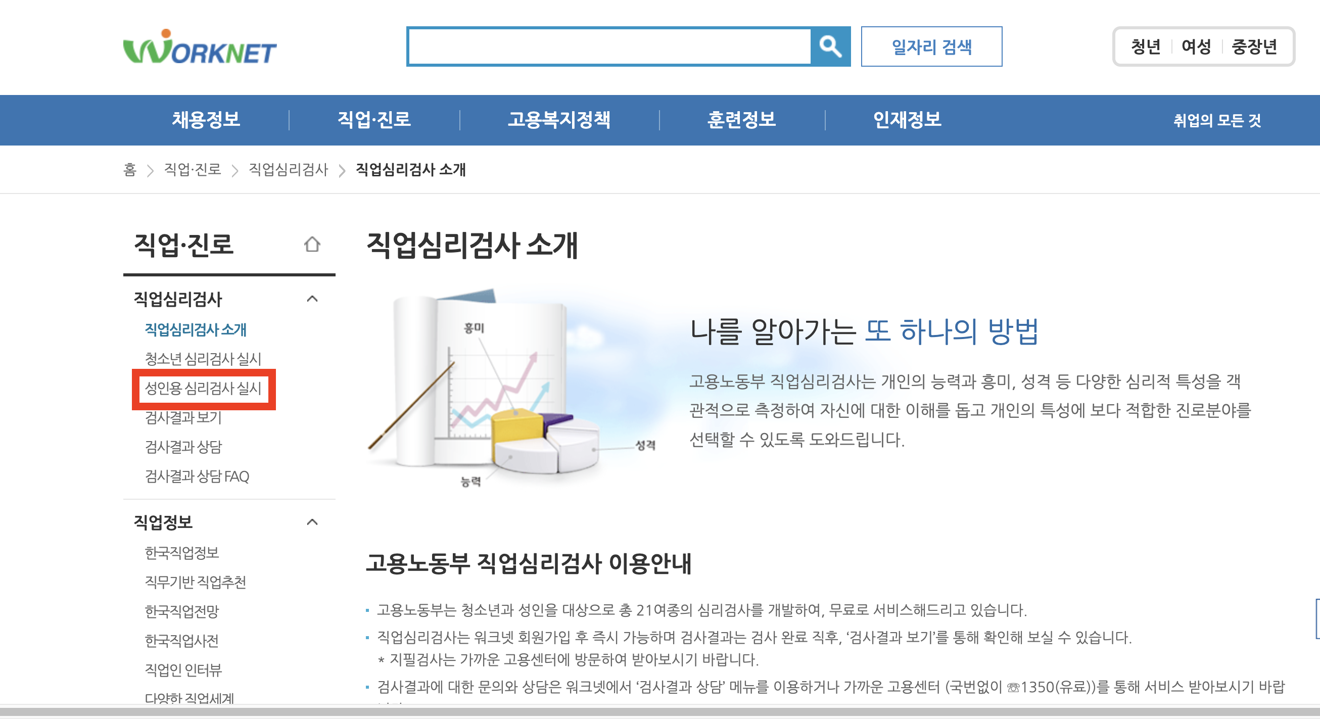 2. 직업심리검사 소개→ 왼쪽 메뉴에서 성인용 심리검사 실시를 클릭해줍니다.