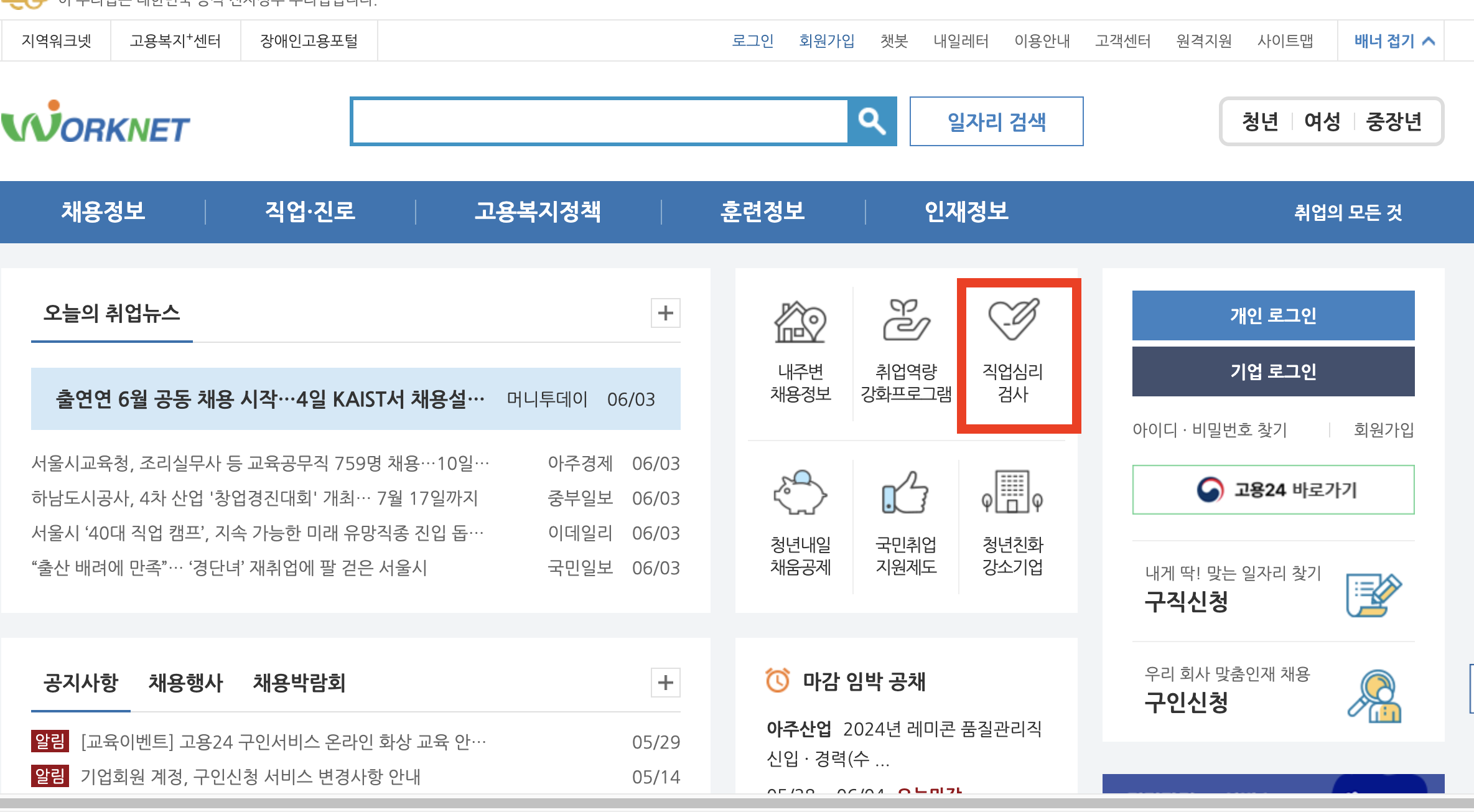 1. 워크넷 홈페이지에 접속해서 로그인한 후 '직업심리검사'를 클릭해줍니다.
