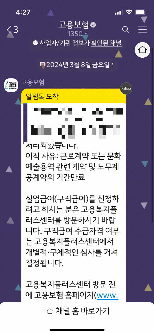 고용복지센터를 다녀왔는데 마침 도착하는 알림톡! 이직확인서 처리가 완료되었다고 합니다.