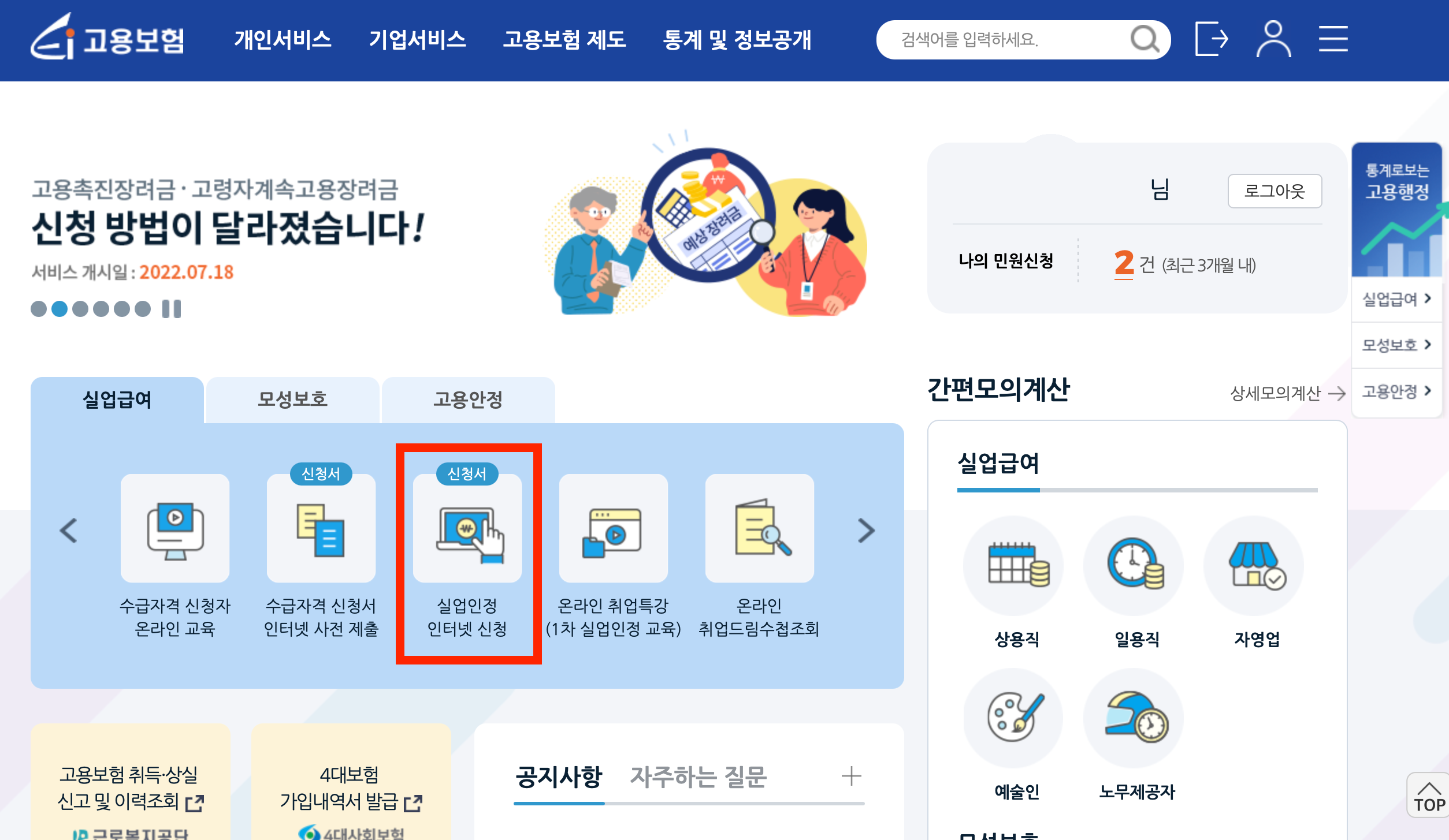 - 실업인정 - '실업인정 인터넷 신청'을 클릭해주세요.