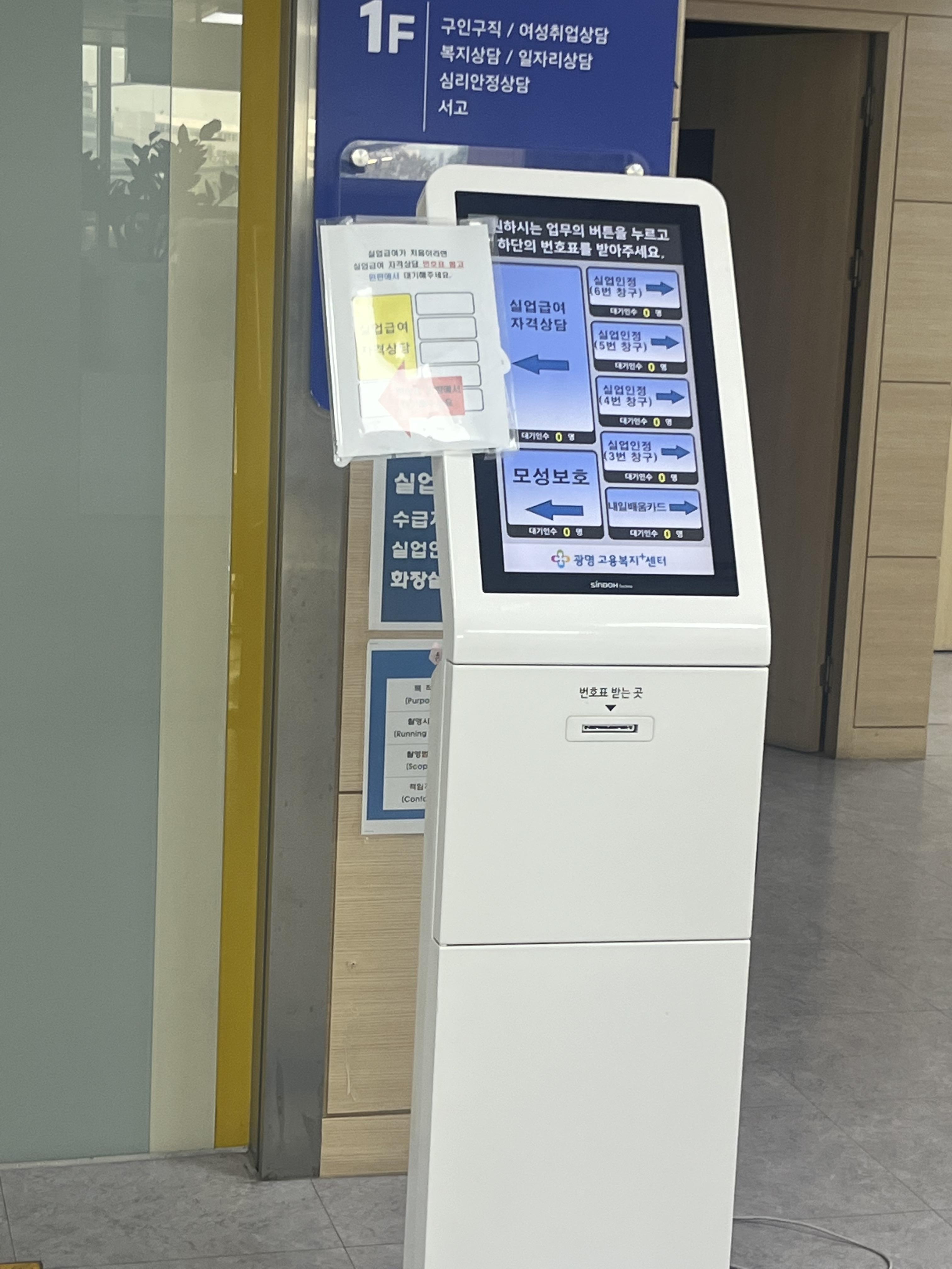 1. 번호표 뽑기 → 2. 실업인정신청서 작성 → 3. 창구 안내 → 4.구직활동 서류 제출
