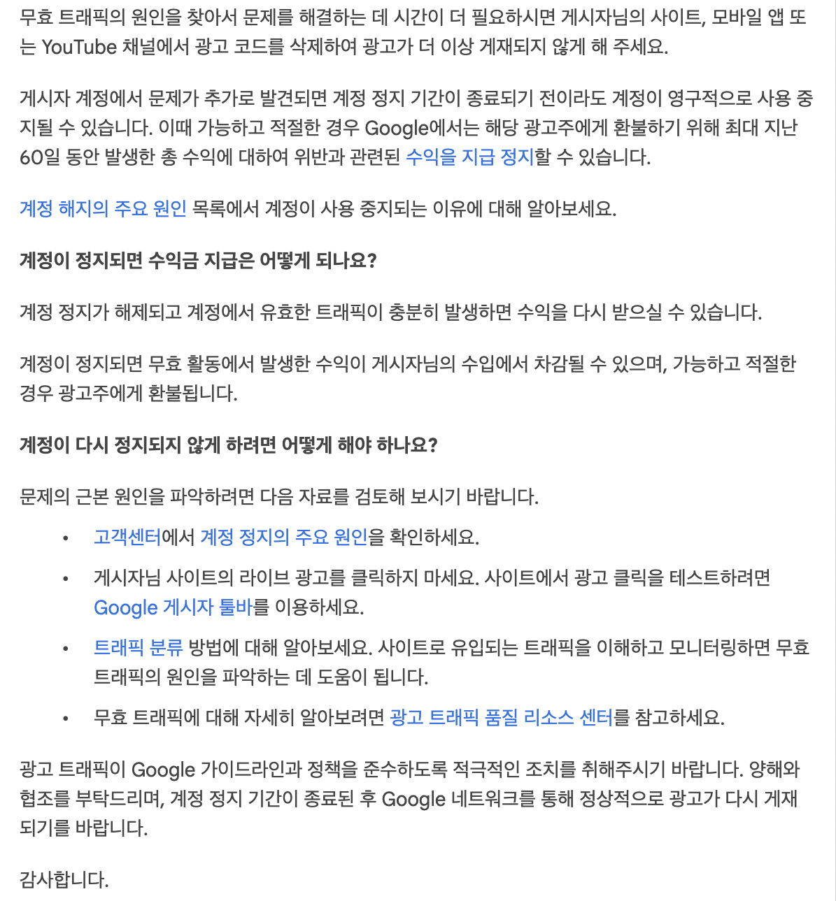 무효 트래픽의 원인을 찾아서 문제를 해결하는 데 시간이 더 필요하시면 게시자님의 사이트, 모바일 앱 또는 YouTube 채널에서 광고 코드를 삭제하여 광고가 더 이상 게제되지 않게 해 주세요.
