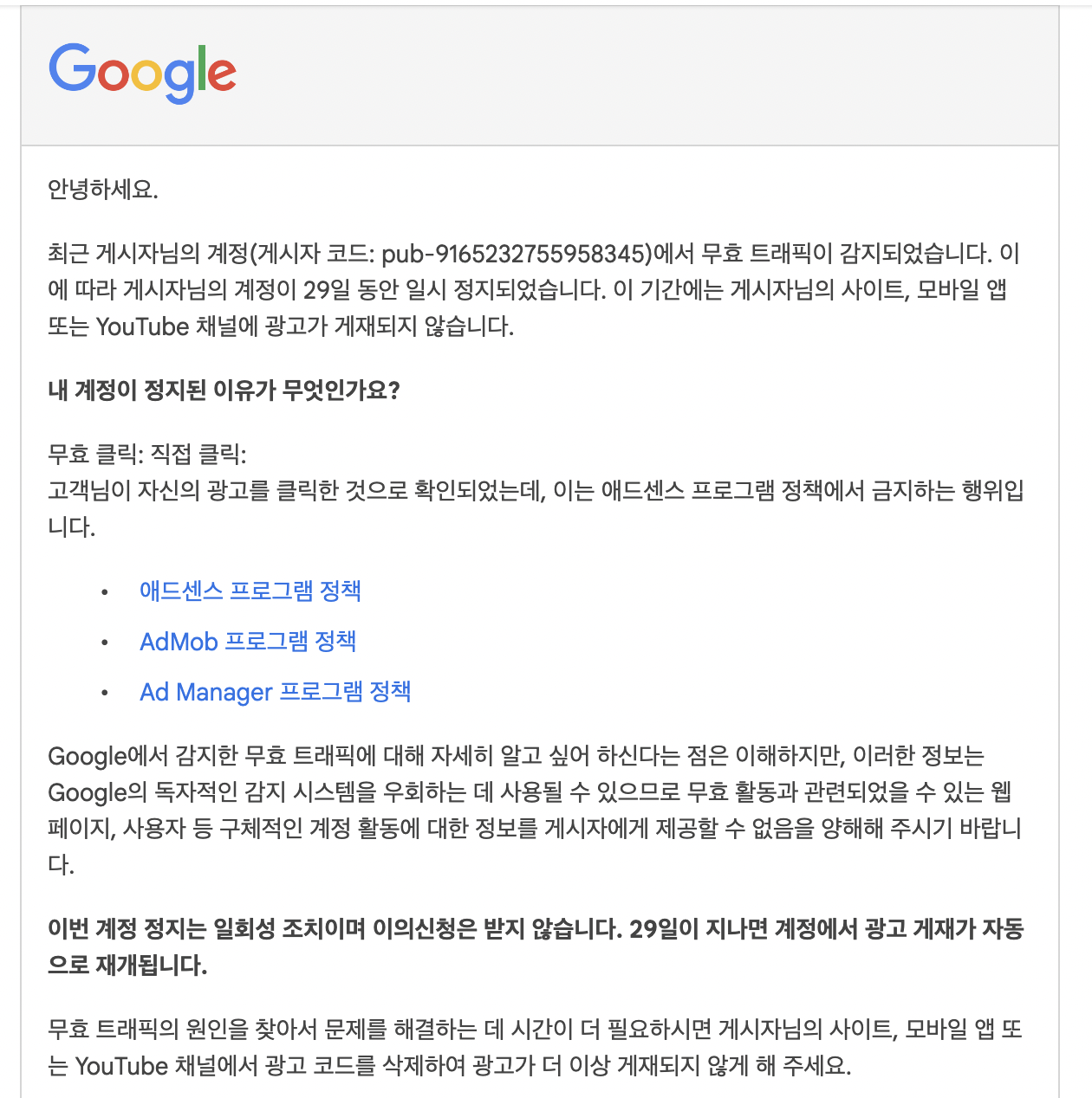오전 8시부터 온 메일에 너무 허탈하였고 왜 구글은 경고를 이렇게 쎄게 하는 것인가 조금 허탈한 마음도 들었지만 어쨌든 정책을 어긴 거니까 앞으로 그러지 않겠다고 다짐하며, 자동광고, 수동광고를 해제시켜두었습니다. 혹시나 그 사이에 같은 문제가 반복될 수도 있으니까요.