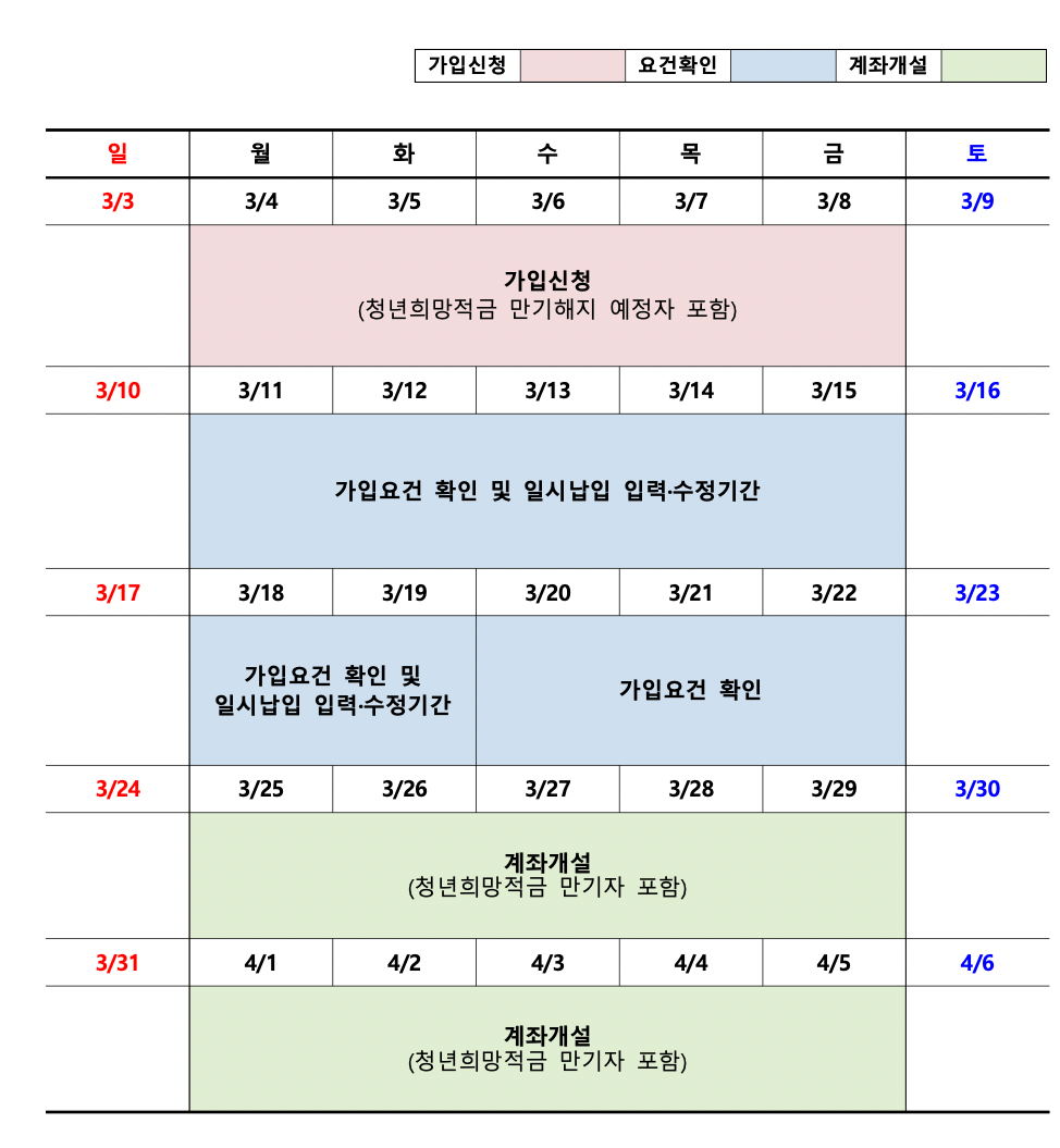 - 계좌개설 : 3/25 - 4/5 (청년희망적금 만기자 포함)