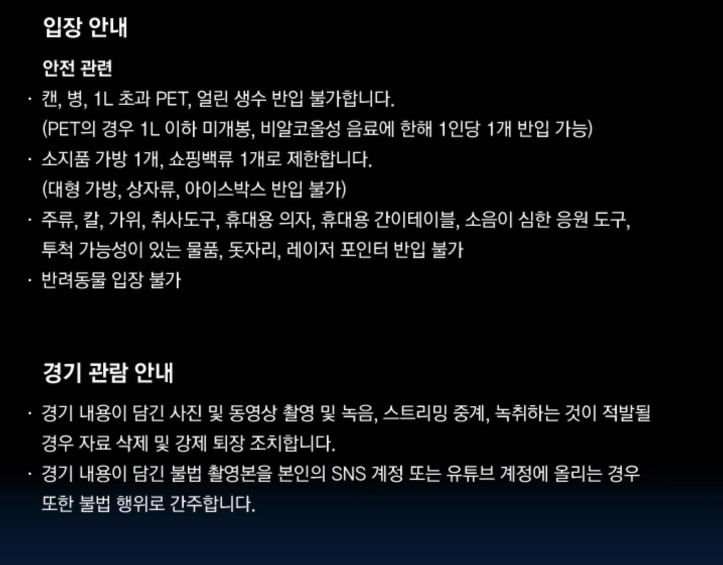 경기 관련 정보와 주의사항을 안내해드리겠습니다. 아직 예매를 못하신 분들은 취소 표를 노려보시길 바랍니다.