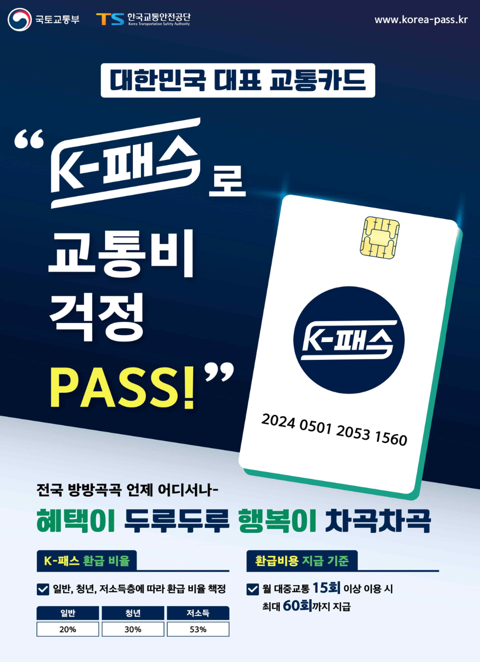 - 5월 1일 출시되는 K-패스 앱 또는 누리집(korea-pass.kr)에서 신규 회원가입 절차를 거쳐 혜택을 받을 수 있습니다.