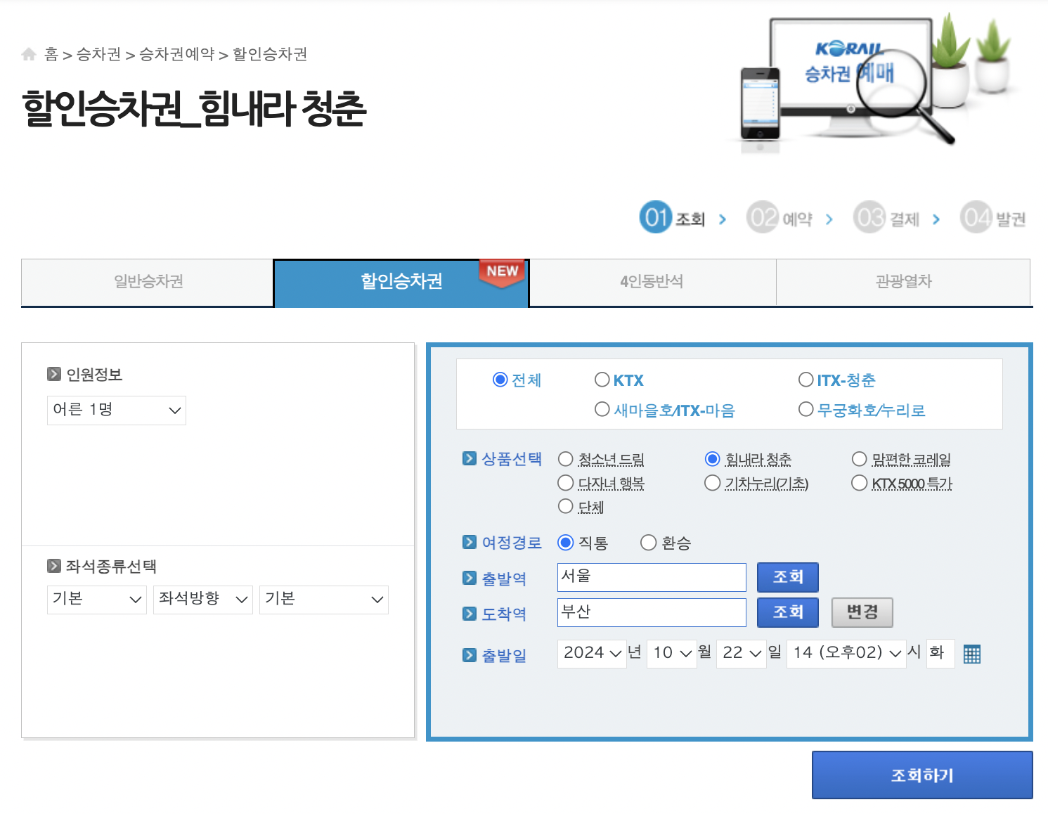 ✔️ KTX 할인승차권 중 '힘내라청춘'은 25세부터 33세 이하의 회원이 이용할 수 있는 상품입니다. 마이페이지에서 동의 후 이용할 수 있습니다.