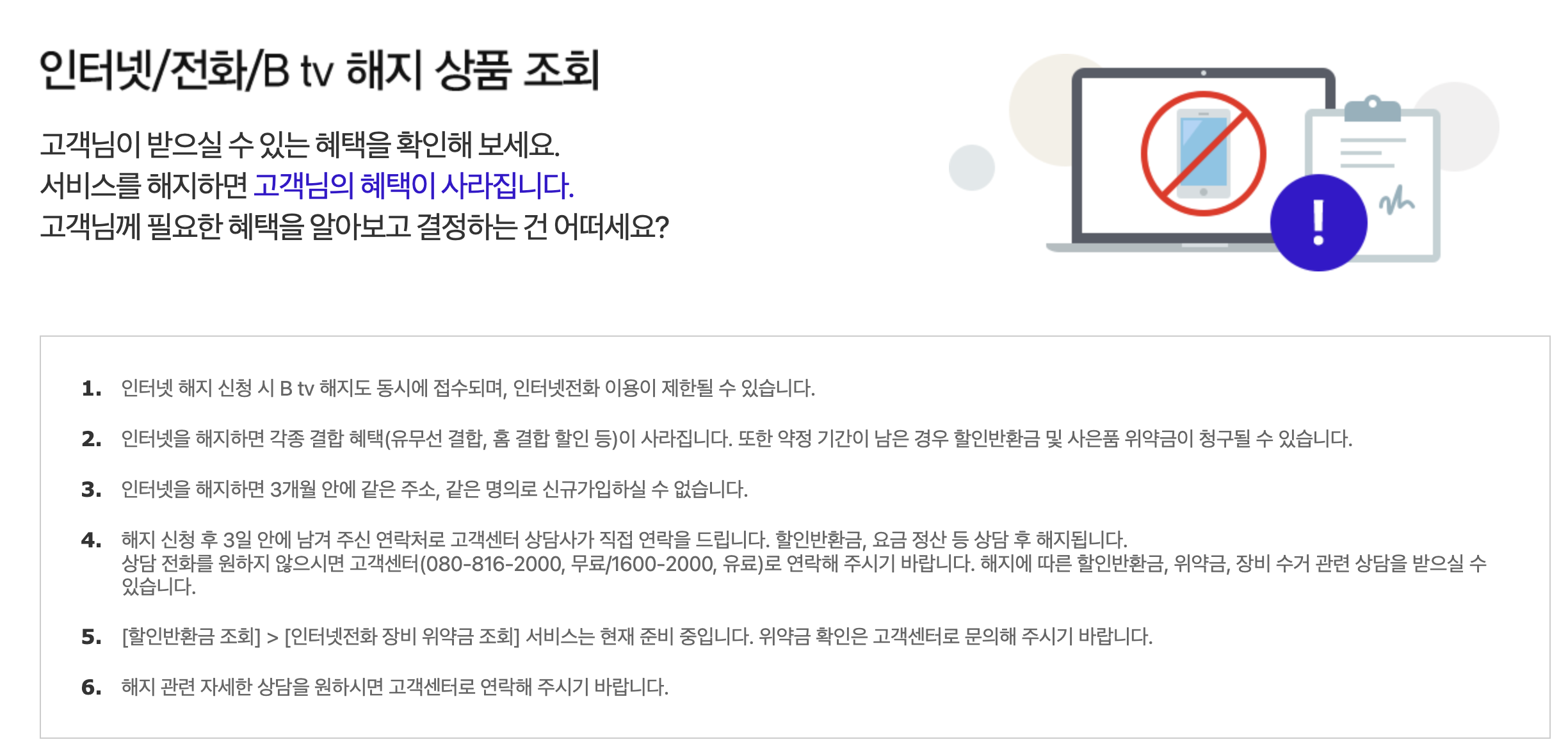 - 결합 상품 확인 : 휴대폰, 인터넷, IPTV 등과 결합되어 있는 경우 해지시 영향을 받을 수 있습니다.