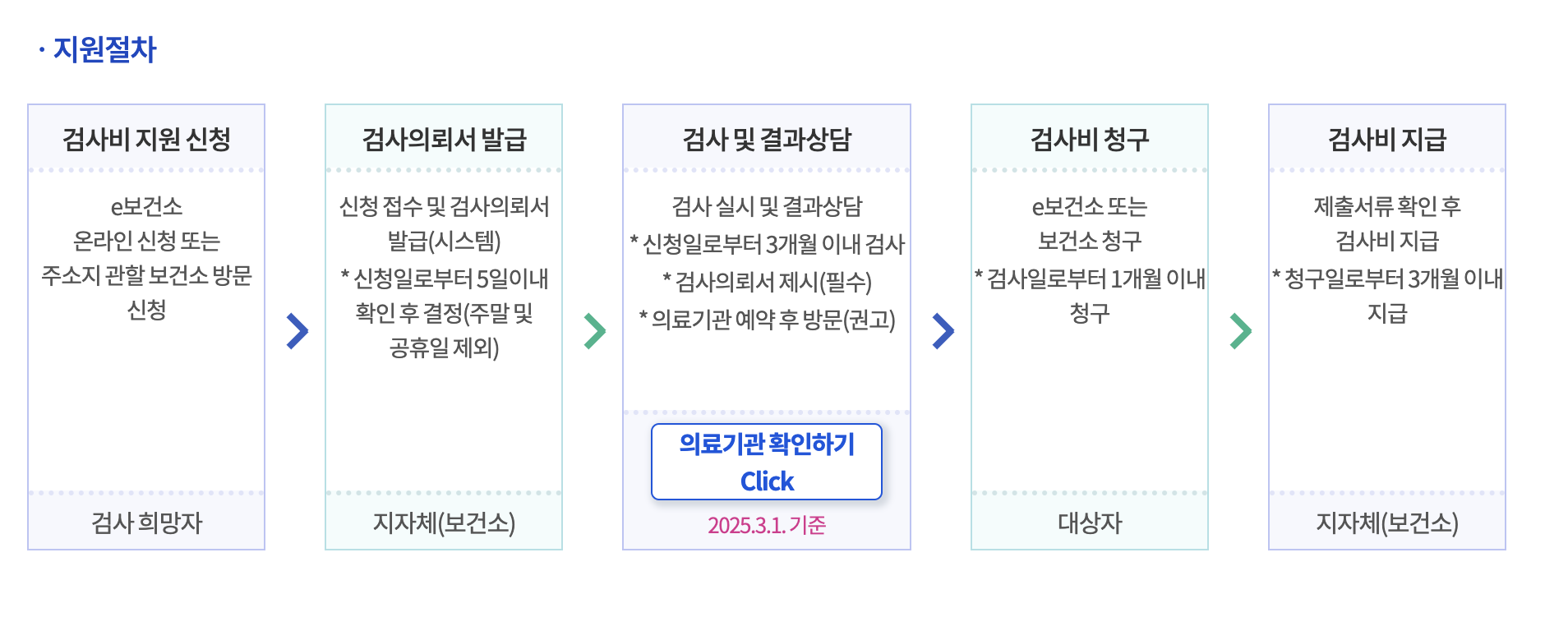 - 검사 후 e보건소 또는 관할 보건소에 청구에 필요한 서류를 제출하시면 됩니다.